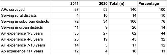 its placed upon the participants make it difficult to draw inferences beyond the limited scope of this study. This study utilizes two surveys, the first conducted in 2011 and the second in 2020. About 140 total surveys were completed by individuals who self-identified as āAPā(s). Both surveys utilized the same descriptive questionnaire, but each targeted different participants to attempt to gain greater reliability of results. In 2011, surveys were sent to all practicing APs in three counties of south-east Michigan, identified by local school district websites. Those participants identified and surveyed in 2020 were self-selected, representing 16 states, and identified via current educational leadership programs. The overwhelming majority (76%) of respondents identified their employment in a suburban community; however, participants from urban and rural districts were also represented in the results of these surveys.